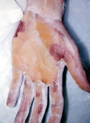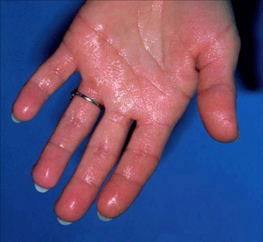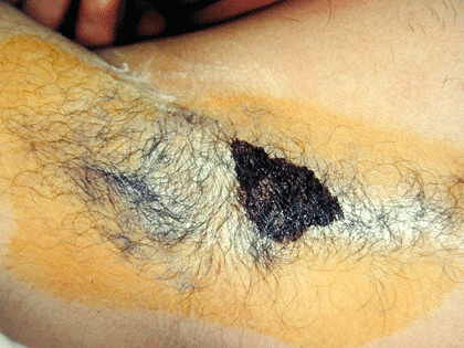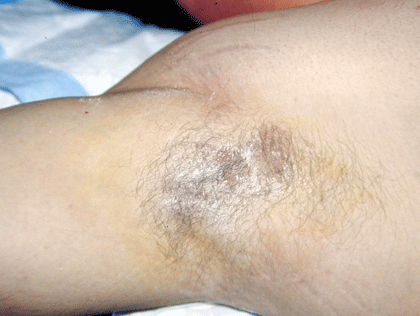 Patient before treatment. A simple test (starch iodine test) can be done to see the area of sweating. The area in black represents the area sweating. |